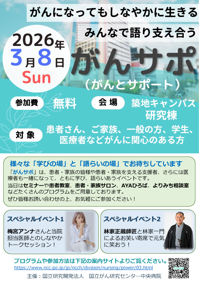 中央病院主催「がんとサポート(通称:がんサポ)~がんになってもしなやかに生きる!みんなで語り支え合う~」は、患者・家族の皆様や患者・家族を支える支援者、さらには医療者も一緒になって、ともに学び、語らいあうイベントです。