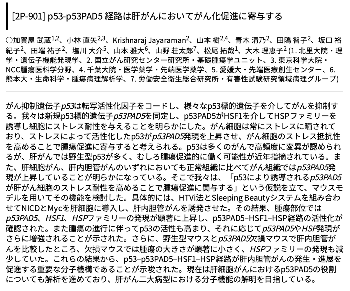 2025年9月 研究発表 大木 理恵子さんが 第84回日本癌学会学術総会のシンポジウム「がん抑制遺伝子p53の新規機能の解明と臨床応用」で 発表を行いました。
