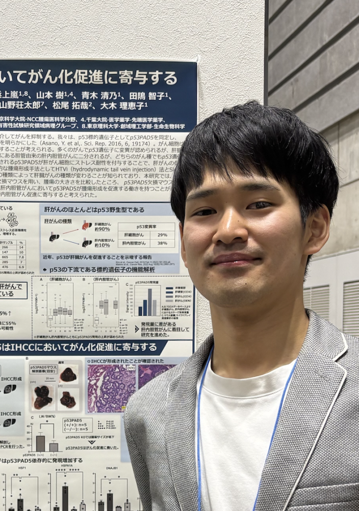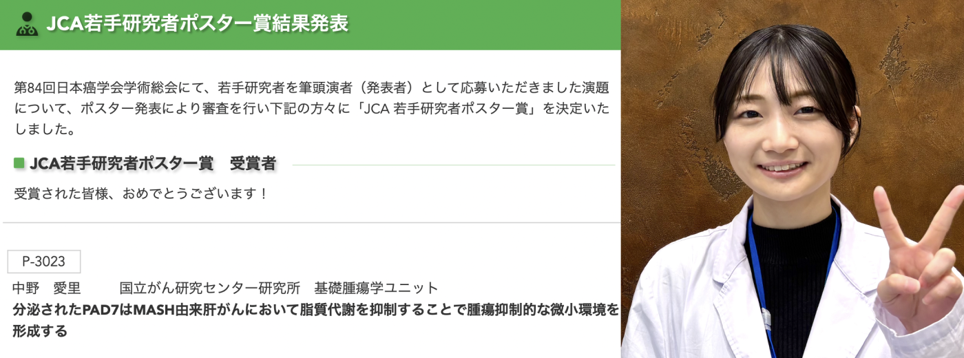2025年11月 研究成果 第84回日本癌学会学術総会で、分泌されたPAD7の肝がんでの機能についてポスター発表を行った、基礎腫瘍学ユニット研修生の中野 愛里さんが、「第84回日本癌学会学術総会 若手研究者ポスター賞」を受賞しました。