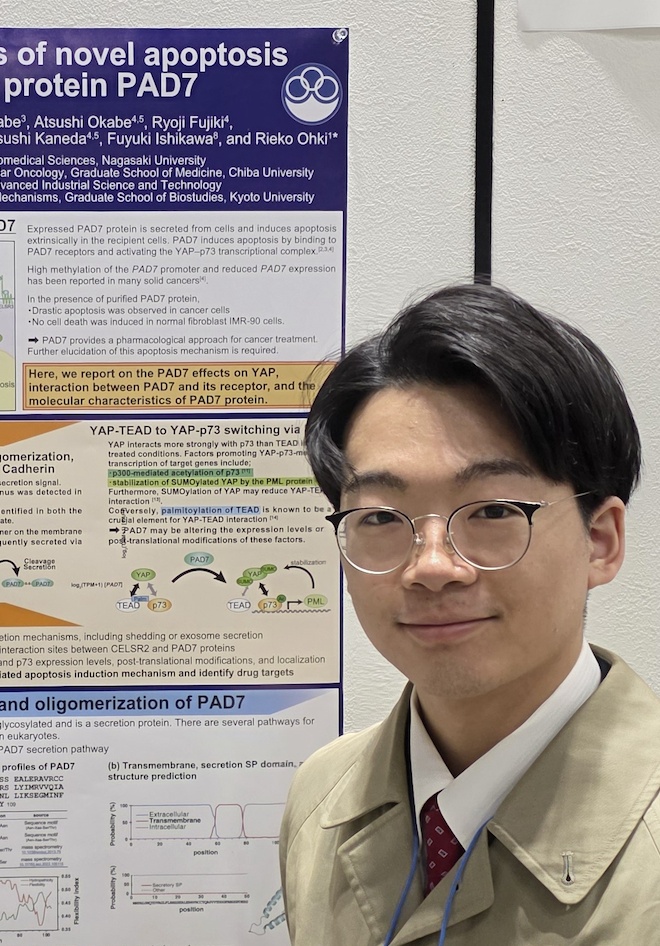 2025年12月 研究成果 第48回日本分子生物学会年会で、基礎腫瘍学ユニット研修生の上野 康大さんが「がん抑制タンパク質PAD7による新規アポトーシス誘導機構の解明」のタイトルでポスター発表を行い、「MBSJ Poster Award 2025」を受賞しました。