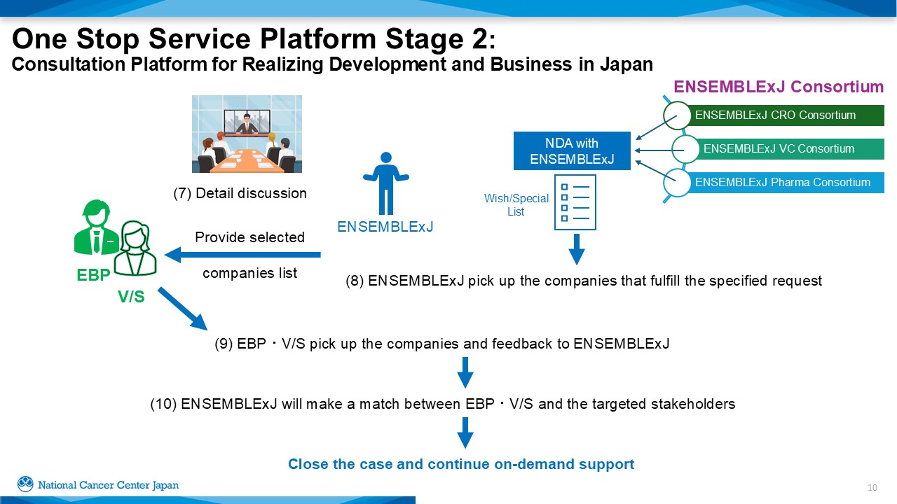 厚生労働省はドラッグラグ・ロス対策の一環として、これらEBPやバイオベンチャーの開発品を円滑に日本に導入するための「国際共同治験ワンストップ相談窓口事業」を開始しました。これを受けて我々国立がん研究センターではプロジェクトチームを立ち上げ、まずは“がん領域”におけるEBPやバイオベンチャーの製品をいち早く、かつ確実に日本市場へ導入するためのワンストップ相談を行う仕組みを構築し、活動を開始しました。